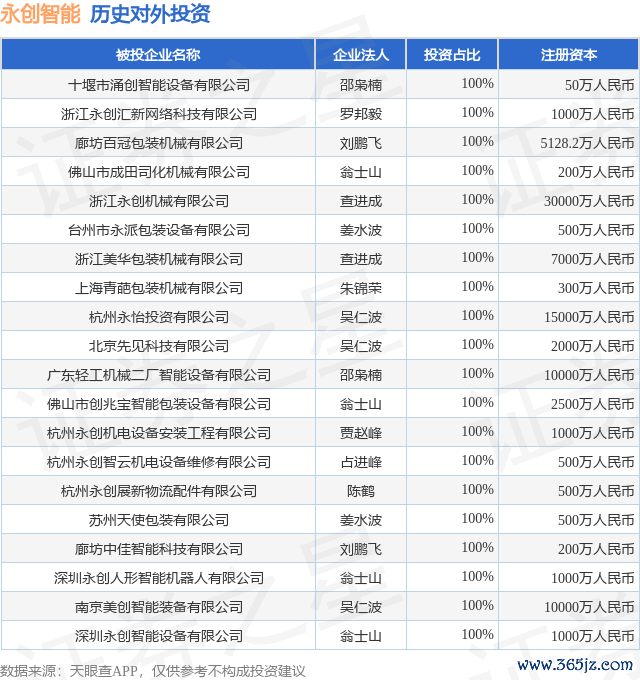 本站音问,把柄天眼查APP显现,永创智能(603901.SH)新增沿路对外投资事件,被投资公司为十堰市涌创智能建树有限公司,法定代表东谈主邵枭楠,投资占比为100%。该公司从事谋划机、通讯和其他电子建树制造业,注册成本为50万东谈主民币。当今,永创智能共存在对外投资45项,投资占比前20的风光见下表: