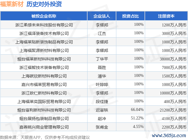 本站音信,凭据天眼查APP露出,福莱新材(605488.SH)新增通盘对外投资事件,被投资公司为浙江柔感改日科技股份有限公司,法定代表东说念主李耀邦,投资占比为100%。该公司从事科技捏行和行使办行状开云体育,注册老本为1200万东说念主民币。当今,福莱新材共存在对外投资13项,详见下表: